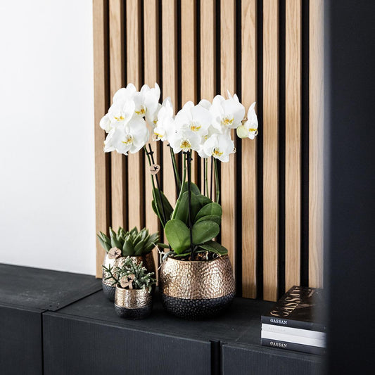 White Orchid – Amabilis + Elite Pot Gold – Pot Size 9cm – 40cm